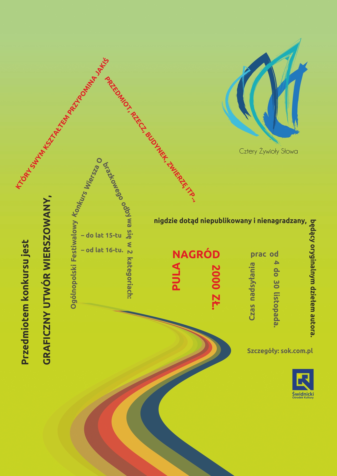 ŚWIDNICKI OŚRODEK KULTURY ogłasza OGÓLNOPOLSKI KONKURS WIERSZA OBRAZKOWEGO Przedmiot konkursu Przedmiotem konkursu jest graficzny utwór wierszowany, którego kształt przypomina wybrany przedmiot, rzecz, budynek, zwierzę itp. Praca musi być oryginalnym dziełem autora, nigdzie dotąd niepublikowanym ani nienagradzanym. Kategorie wiekowe Konkurs odbywa [...]
