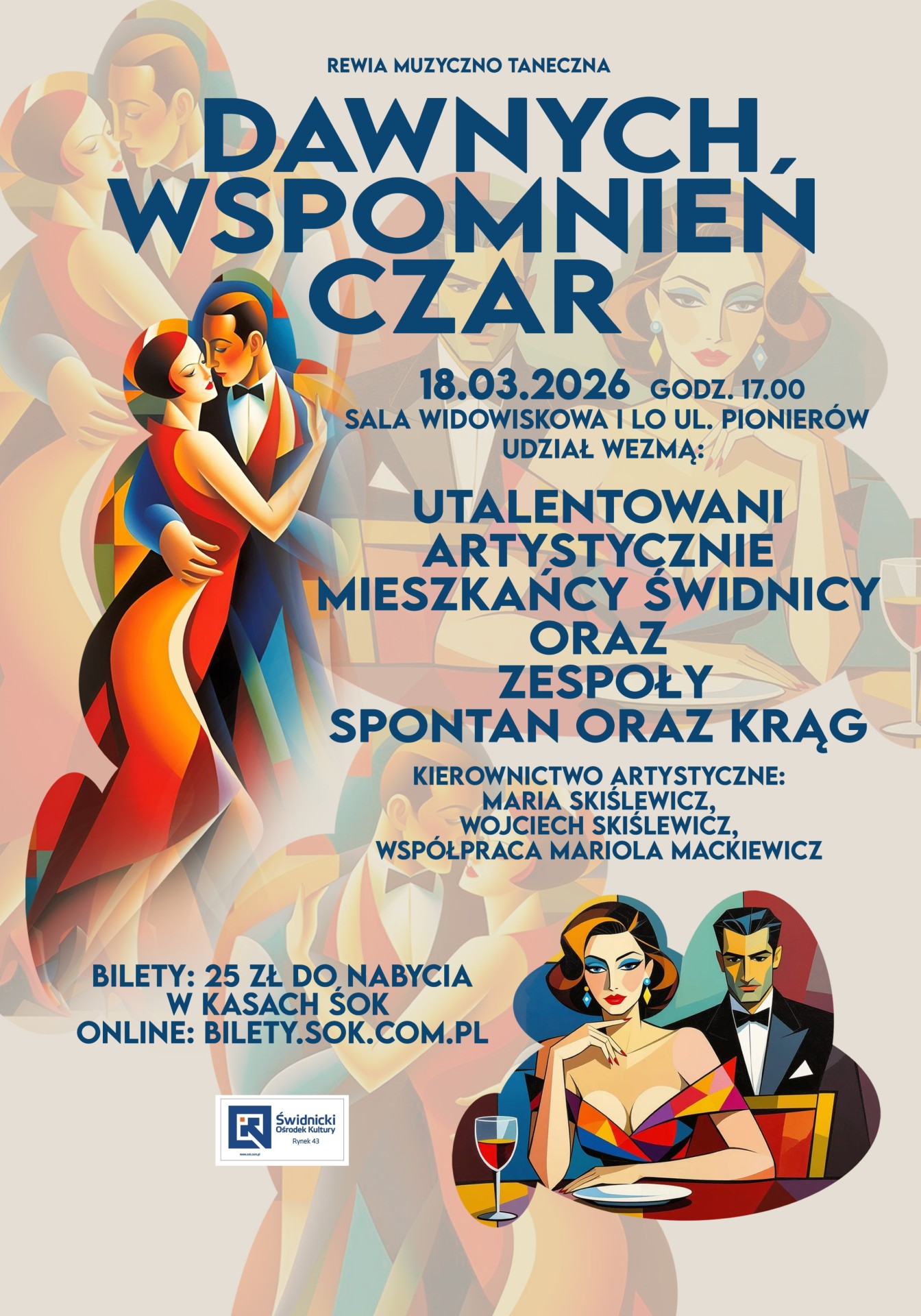 Wieczór pełen tańca, muzyki i nostalgii przygotowany pod kierownictwem artystycznym Marii i Wojciecha Skiślewiczów, przy współpracy Marioli Mackiewicz, będzie prawdziwą ucztą dla miłośników sztuki. W programie m.in. charleston, walczyk, tango oraz żywiołowy rock-and-roll, a także ponadczasowe przeboje takie jak „Ostatnia niedziela” i „Sex appeal”. Przypomnijmy sobie czar lat dwudziestych i trzydziestych!