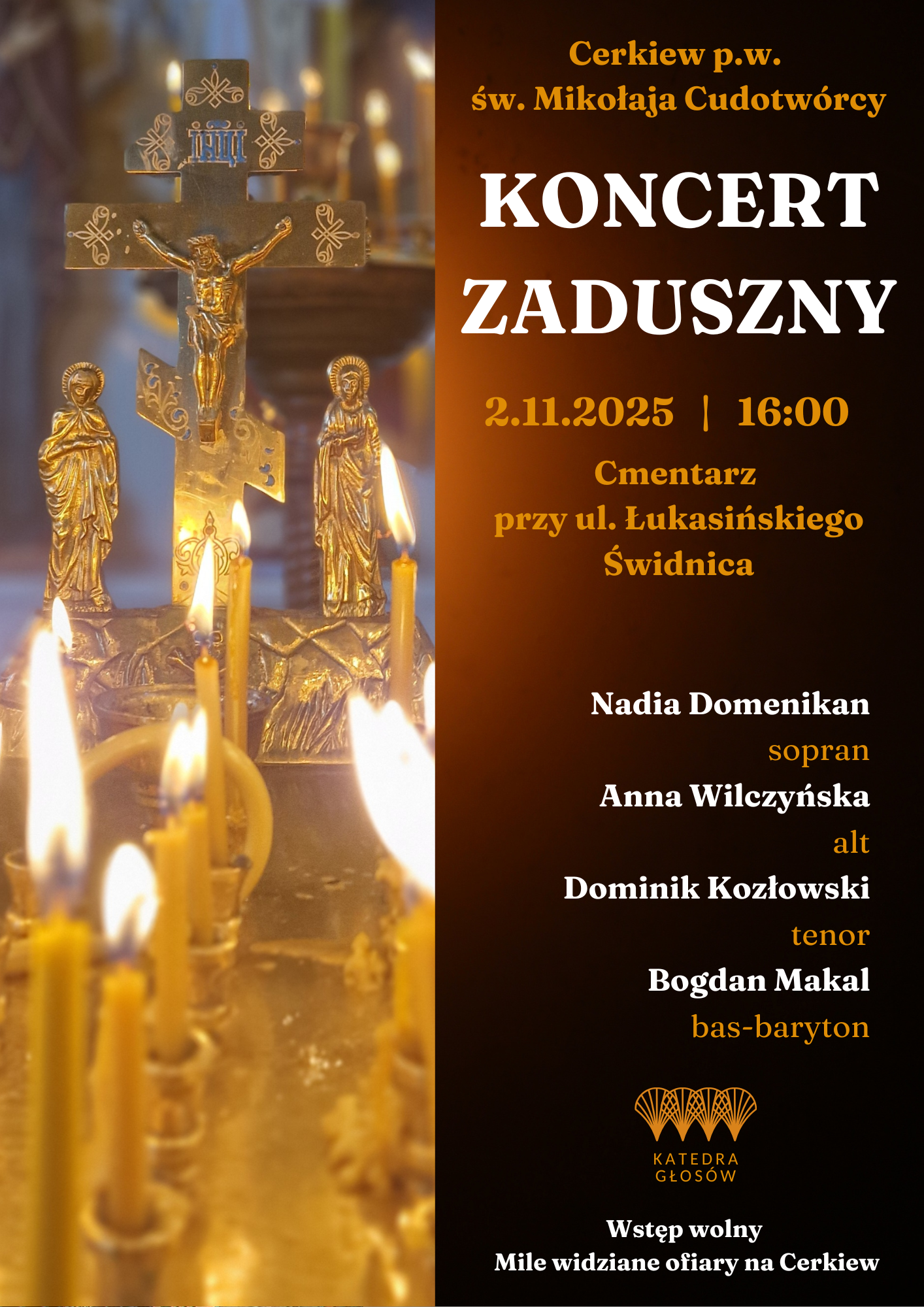 | wstęp wolnyŚwidnicki Ośrodek Kultury zaprasza na wyjątkowy Koncert Zaduszny, który odbędzie się 2 listopada 2025 r. o godz. 16:00 w cerkwi na cmentarzu przy ul. Łukasińskiego w Świdnicy.