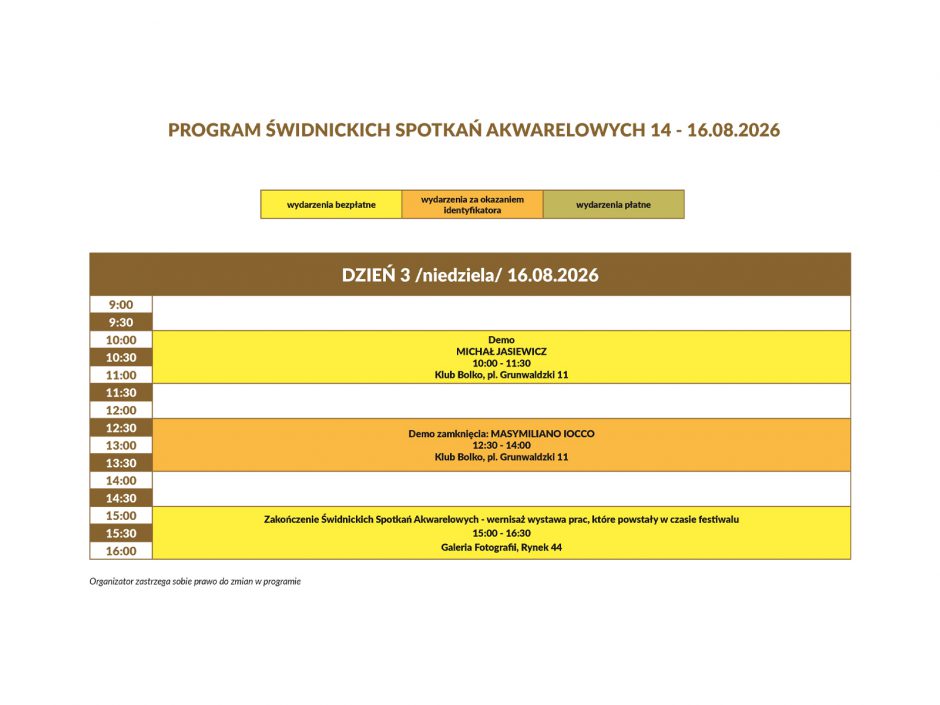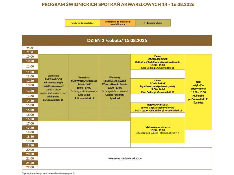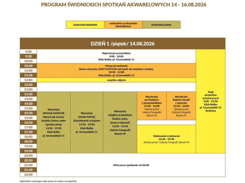 Wejściówka na Świdnickie Spotkania Akwarelowe w cenie 100 zł obowiązuje przez cały czas trwania wydarzenia. Zapewni Wam: identyfikator uczestnika, torbę z prezentami od sponsorów (do odbioru osobistego w trakcie festiwalu), wstęp na wszystkie pokazy (w tym na demo otwarcia i zamknięcia) i plenery prowadzone przez instruktorów, udział w wycieczkach, darmowe wejście do niektórych obiektów oraz mnóstwo zniżek w całej Świdnicy (targi, gastronomia, zwiedzanie).