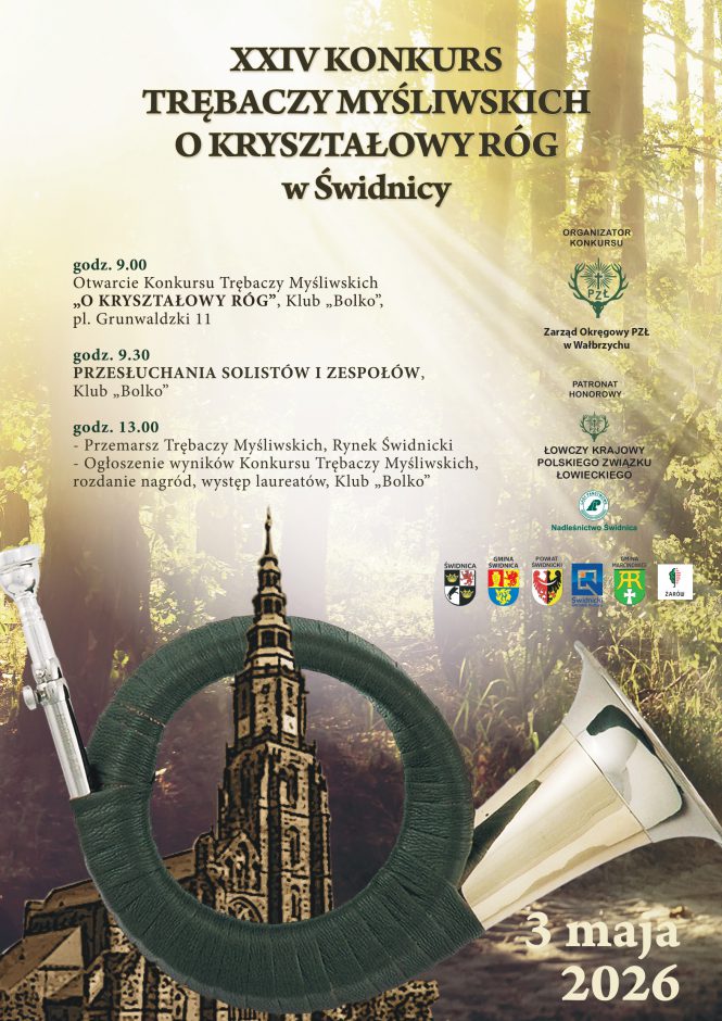| wstęp wolny3 maja Świdnica ponownie stanie się miejscem wyjątkowego spotkania miłośników tradycji łowieckich i muzyki – wszystko za sprawą XXIV Konkursu Trębaczy Myśliwskich „O Kryształowy Róg”.
