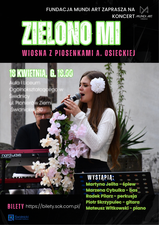 „Zielono mi” to wyjątkowy program muzyczny, który przypomina, jak niezwykle aktualne i poruszające pozostają teksty Agnieszki Osieckiej. Zapraszamy Państwa w pełną emocji podróż przez jej najpiękniejsze piosenki – m.in. „Zielono mi”, „Diabeł i raj”, „Wariatka tańczy”, „Małgośka” – zaprezentowane w nowych, starannie opracowanych aranżacjach.